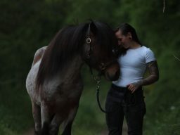 Dem Menschen gegenüber besticht er mit seiner aufmerksamen, ruhigen und neugierigen Art und lässt sich selbst auf der Deckweide nicht von ein paar ausgiebigen Kuscheleinheiten abhalten.